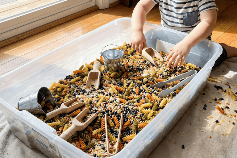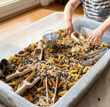 Take a container, add dry rice or pasta, then throw in cups and spoons. Toddlers love scooping, pouring, and hiding little objects.